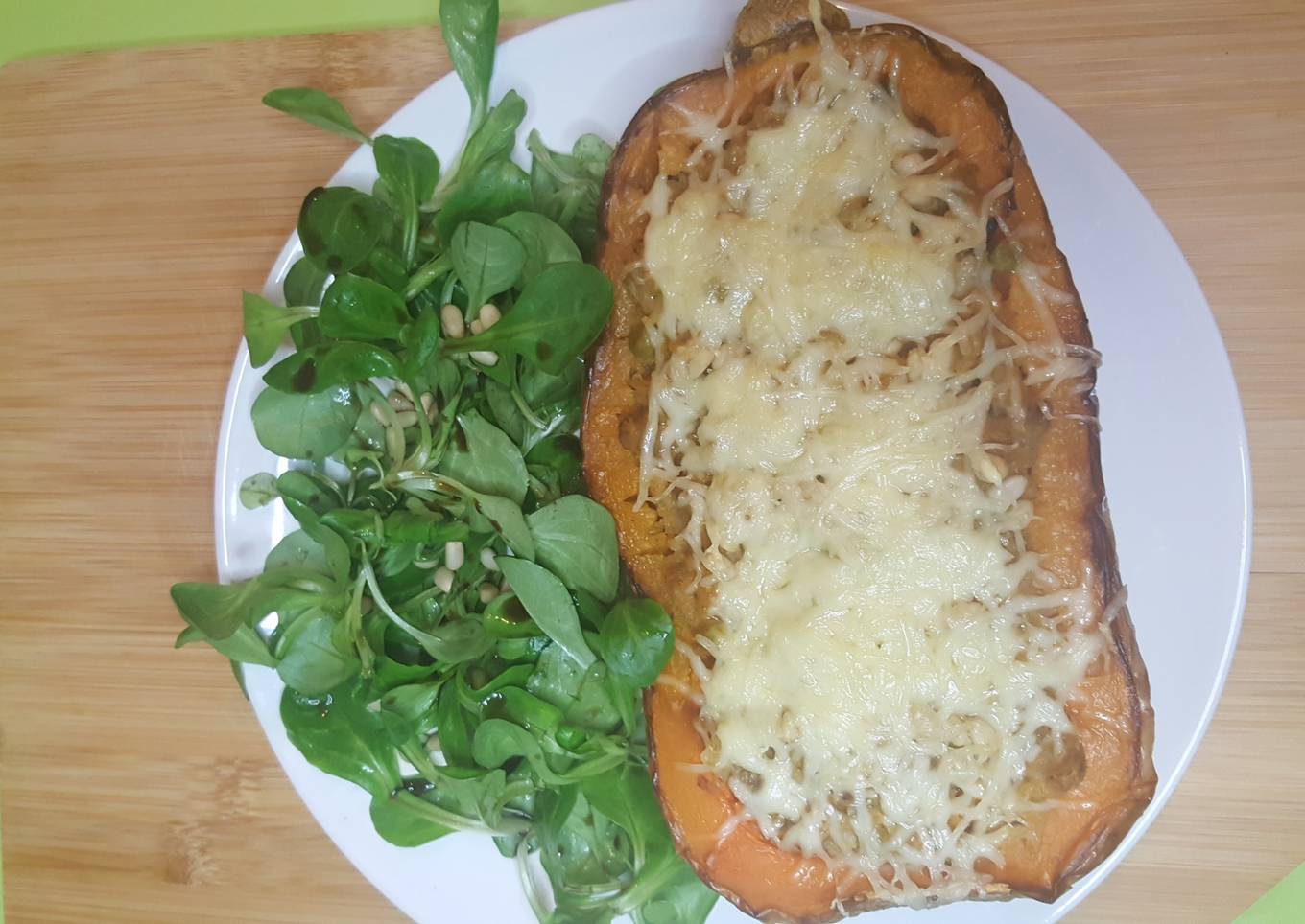 - Mettre une moitié de farce dans la Butternut puis déposer la mozzarella et recouvrir de farce. Soupoudrez de pignon de pain puis généreusement de gruyère. Au four à 180 pendant 15mn. Je l'ai accompagné de salade de Mâche assaisonné.Voila c'est prêt. Bonne préparation
