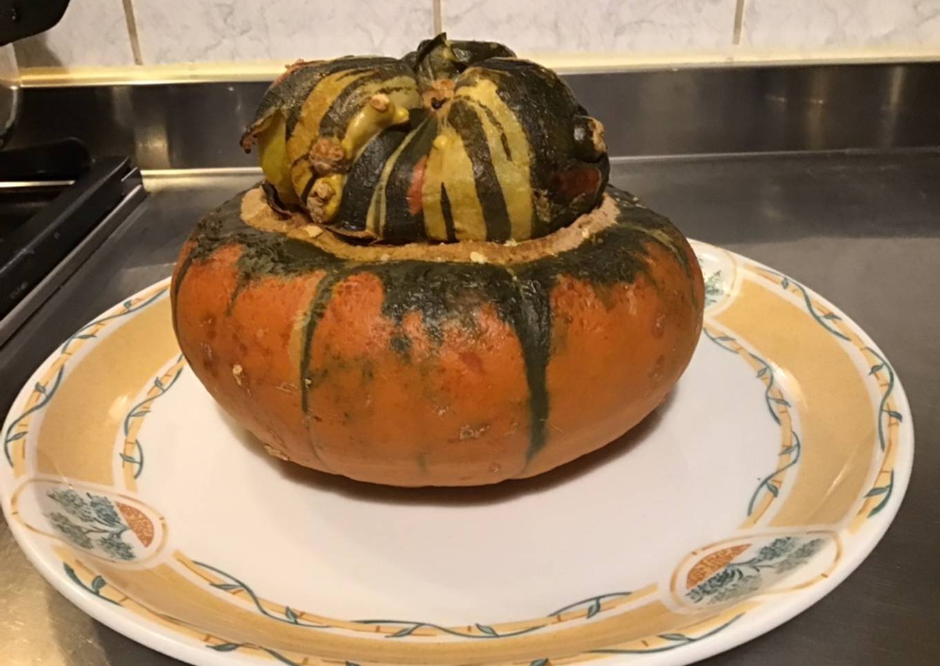 - Poser la courge sur le plat de service et superposer le chapeau farci