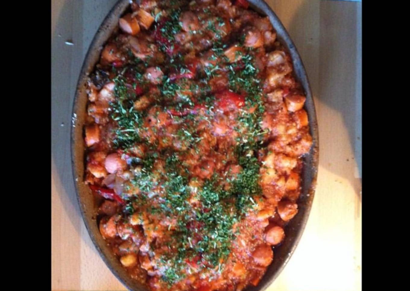 Gratin d attieke aux saucisses poivrons tomates et champignons
