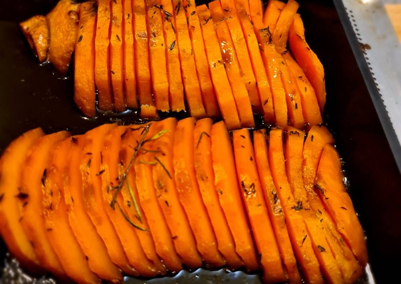 - Sortir la courge et trancher des lamelles pas trop fines sur la longueur arrosez de miel et soja sel poivre et des aromates placez au four cuisson à 200°c 30min. Toujours couverte de papier sulfurisé. Servir aussitôt.