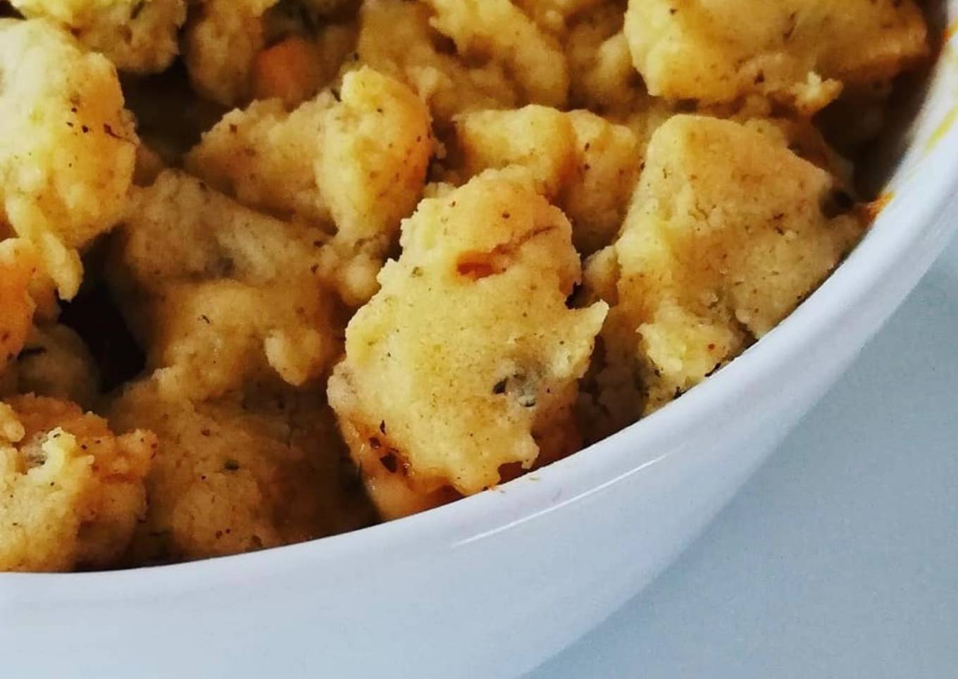 - Préparez la pâte à crumble. Mélangez au doigt la farine et le beurre coupé en dés. Ajoutez une pincée de piment doux, sel, poivre, un peut d’herbes de Provence et le parmesan râpé. Formez une boule et placez au réfrigérateur pour qu’elle durcisse un peut.