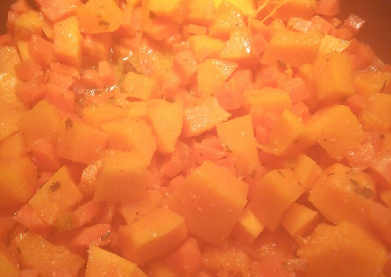 - Éplucher et couper potimarron et carottes en petits dés. Les faire revenir dans de l'huile d'olive et du beurre. Assaisonner.
