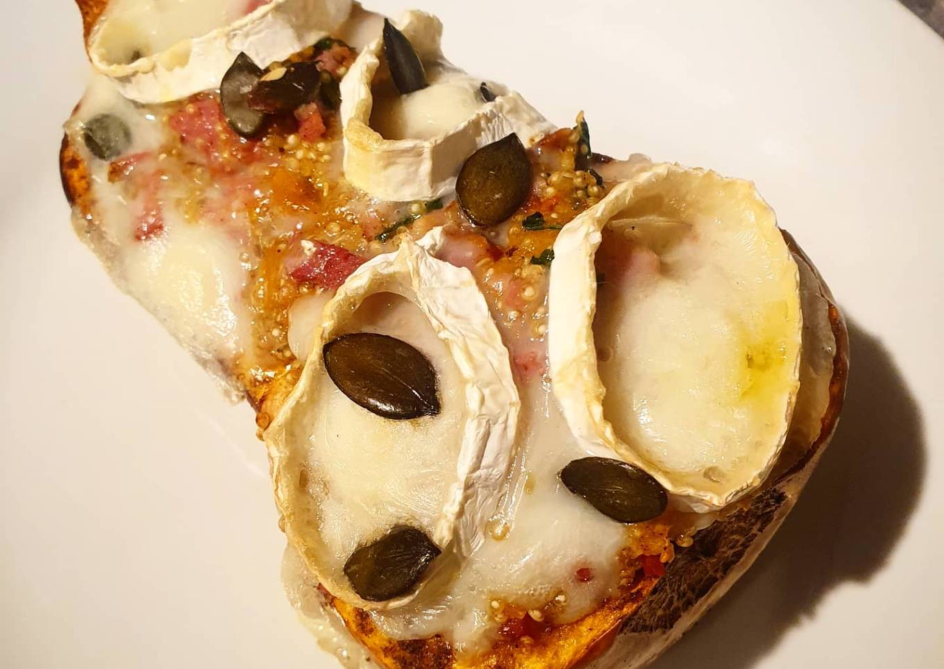 - Remplir les cavités de la butternut avec la farce. Tasser et recouvrir de fines tranches de fromage de chèvre. Parsemer de quelques graines de courges et ajouter un léger filet d'huile d'olive (et/ou un peu de miel pour plus de gourmandise).