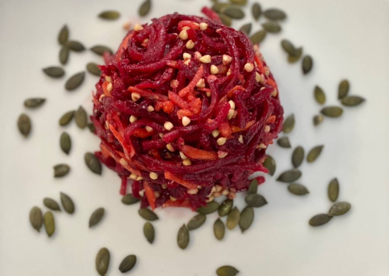 - Quand le sarrasin est prêt éplucher la betterave et la carotte et les râper ou les passer au robot.