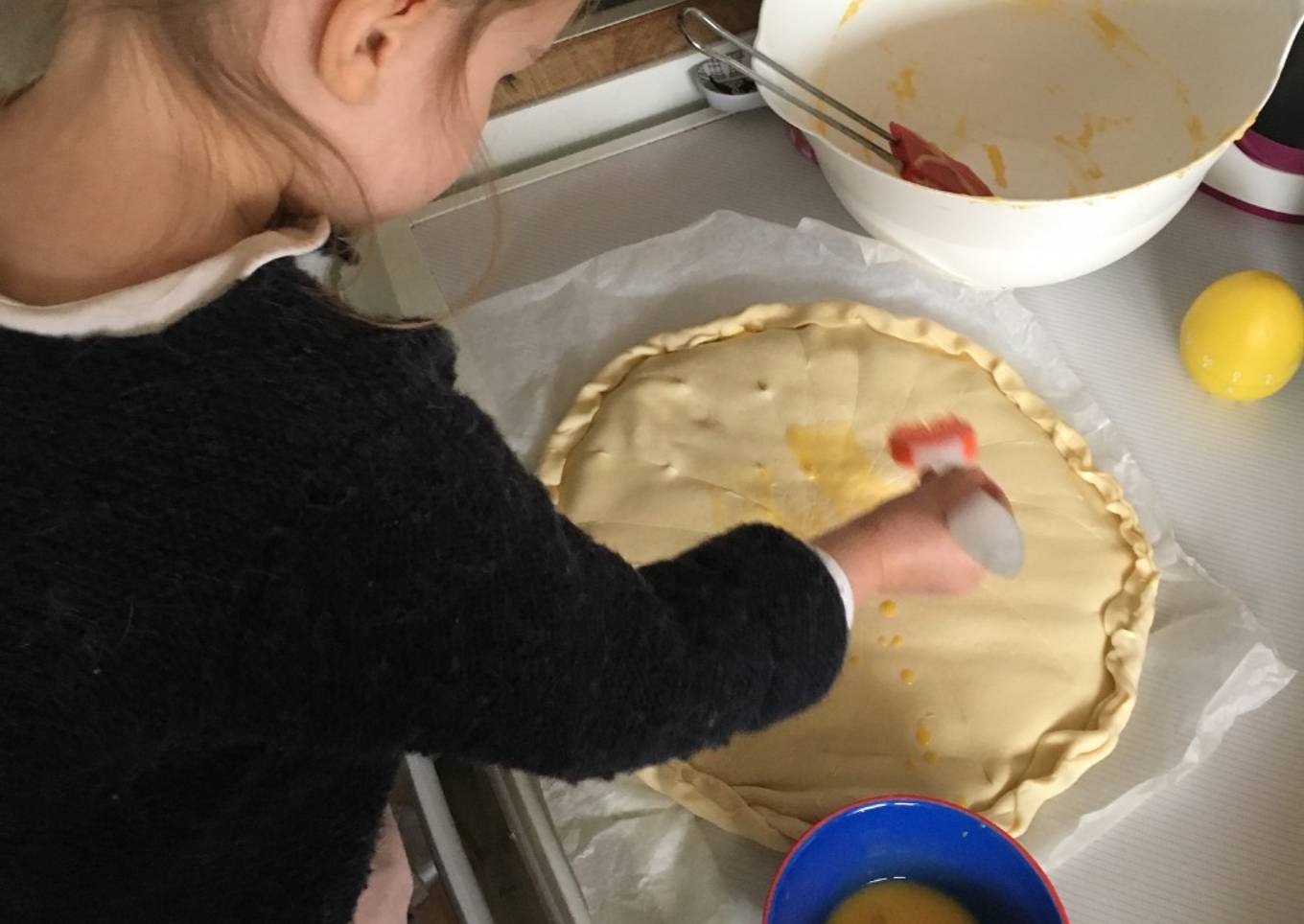 Une belle façon de cuisiner en famille et faire participer nos filles (2,5 ans et 14 mois) à la cuisine avant de déguster cette délicieuse galette un peu tiède.