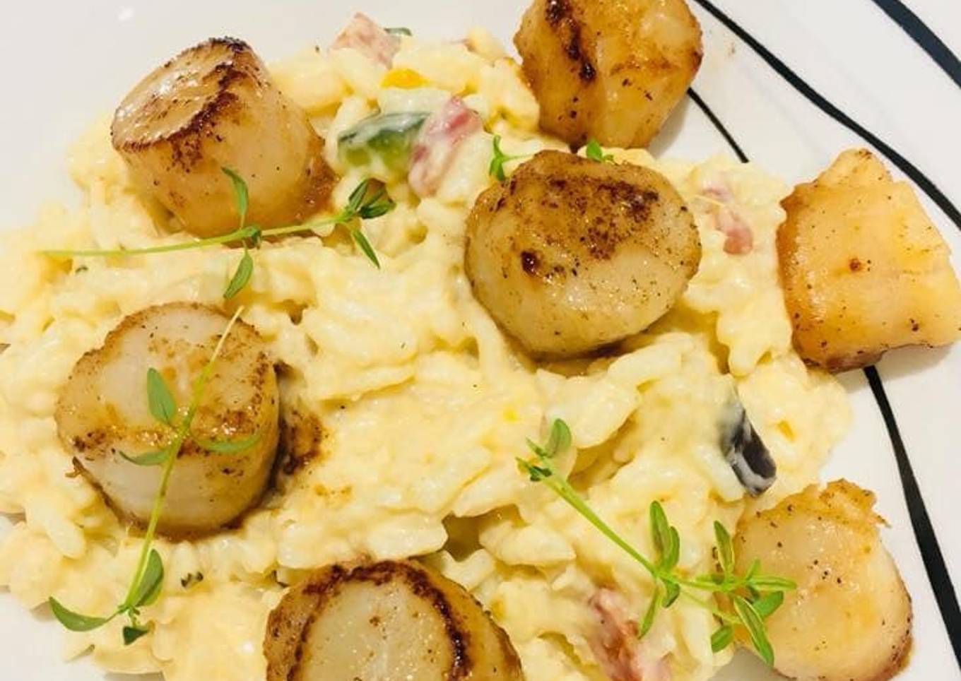 - Dressez le Risotto dans des assiettes creuses, déposez les noix de Saint-Jacques par-dessus et décorez d’herbes fraiches.
